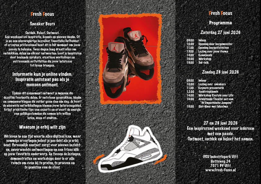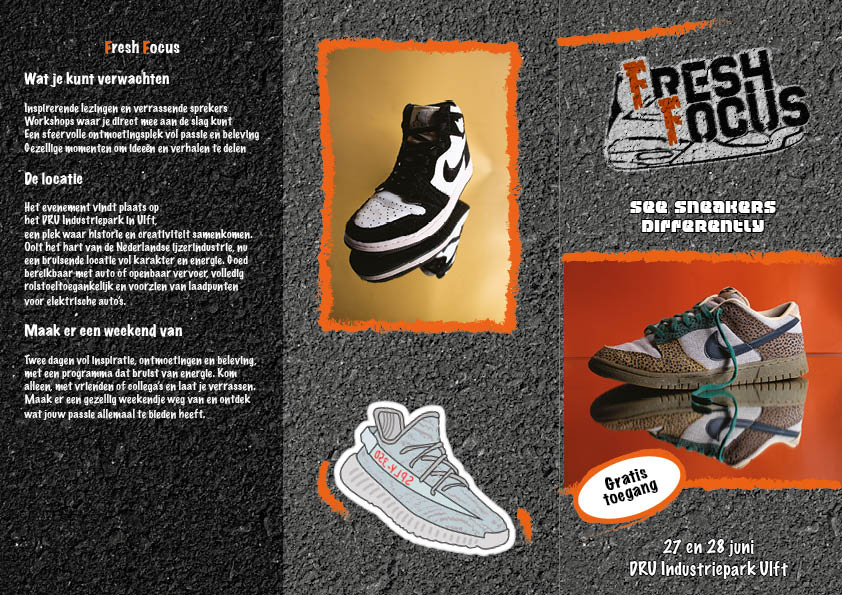 Voor de opdracht Fresh Focus heb ik promotiemateriaal ontwikkeld voor een sneaker tentoonstelling. Het doel was om een herkenbare visuele stijl te creëren en deze door te voeren in verschillende media-uitingen, zoals een logo, visitekaartje, folder, fotografie en een promotievideo. Tijdens dit proces heb ik gewerkt vanuit een moodboard en feedback van de opdrachtgever gebruikt om mijn ontwerpen te verbeteren. Zo heb ik geleerd hoe belangrijk het is om consistent te blijven in stijl en vormgeving binnen een project.